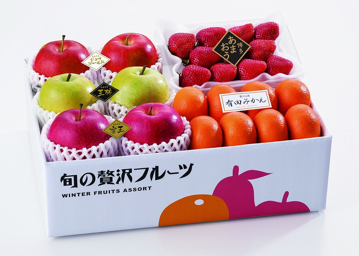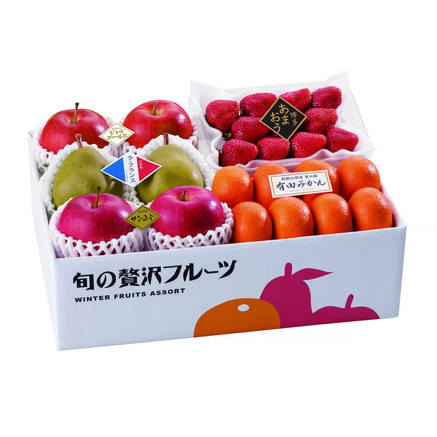 サンふじ、ジョナ・ゴールド(青森県産)各約250g×各2、ラ・フランス(山形県産)×2、あまおういちご(福岡県産)約250g×1、有 田みかんSもしくはMサイズ(和歌山県産)約800g