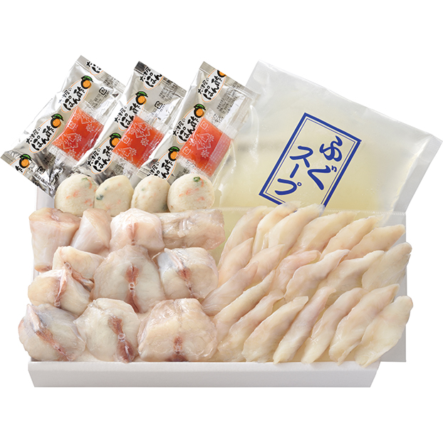 真ふく切り身300g、真ふくスライス100g、ふく入りつみれ×4、ふぐスープ500g、ぽん酢30ml×3、もみじおろし5g×3