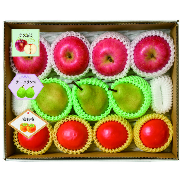 サンふじ約250g×4個(青森県又は岩手県産)、ラフランス約270g×3個(山形県産)、 富有柿約230g×4個(福岡県又は奈良県産)