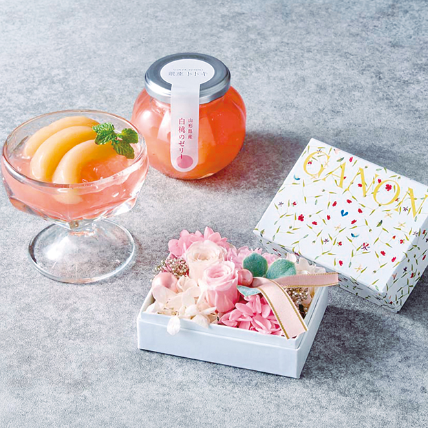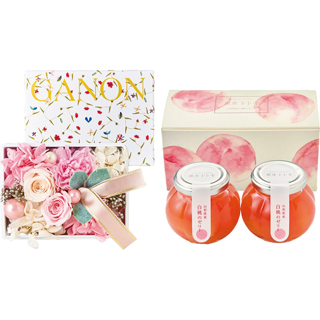 【母の日】「GANON FLORIST」監修プリザーブドフラワーと「銀座トトキ」監修山形産白桃のゼリー【6003】